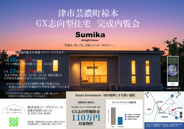津市芸濃町椋本 平屋 GX志向型住宅 完成内覧会